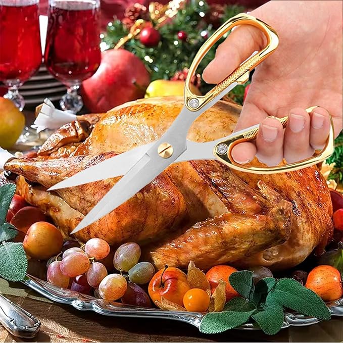 - KITCHEN SISSORS FOR POULTRY ERGONOMIC HANDLE- Poultry shears heavy duty professional ergonomic handles are specially designed according to the large hands of Americans.The meat shears heavy duty have larger and longer handles,Clever use of leverage principle, more labor-saving,making it easier for you to complete heavier cutting tasks.Utility scissors heavy duty multipurpose food scissors Built-in spring loading,you can easily handle the entire large turkey without a lot of effort.