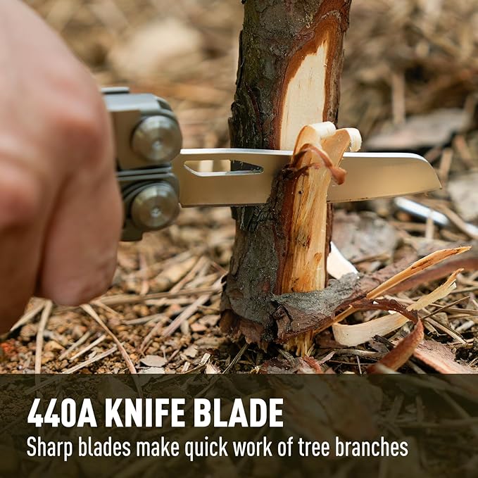 - 【440A STAINLESS STEEL】This multi tool plier features high-alloy 440A steel giving an exceptional blend of hardness and durability to the edge, allowing for a precise and sharp edge. The great steel has a hardness of 54 +/- 2 on the Rockwell Hardness Rating and is also highly rust-resistant.