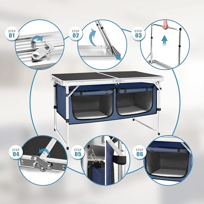 - [Spacious organizer] Our outdoor folding table has 2 large capacity lockers for all kinds of food, drinks or cutlery, keep the food or cookware clean and hygiene. Detachable storage bag allow easy storage and convenient portability.