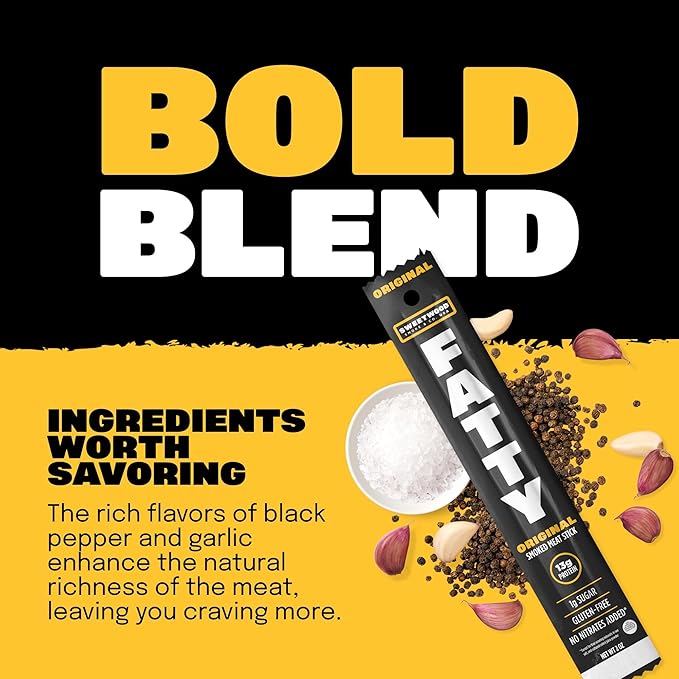FATTY Meat Sticks, Made with Grass Fed Beef, Pork Raised Without Antibiotics, 13g Protein Per Stick, Original, 2 oz. (Pack of 5)
