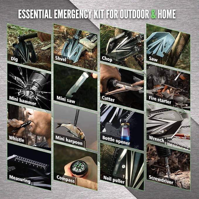 - ๐ฅMultifunctional survival tool:๐ฅ The camping shovel surface is designed with saw, nail puller, scale, wire cutter, wrench, chopper. The handle includes bottle opener, mini harpoon, screwdriver, fire starter, whistle, mini hammer, compass. Very suitable for chopping, shoveling, cutting, sawing, digging, hammering.