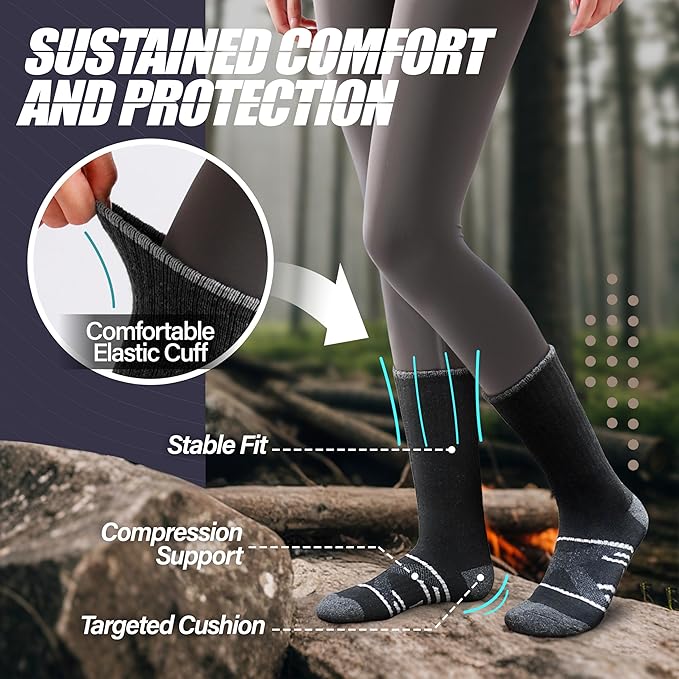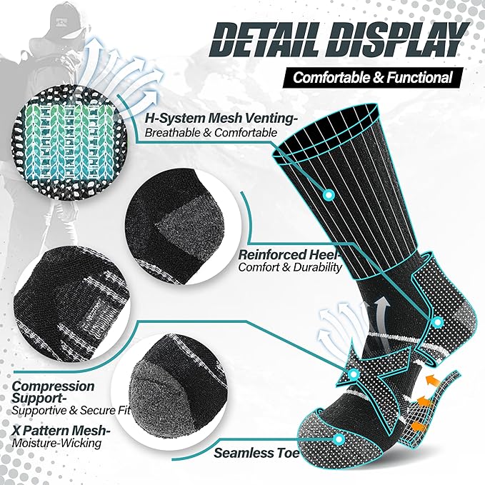 - Gentle Compression Support: With soft elasticity design and compression stripes along the calf and foot arch, these socks provide a snug, secure fit that keeps them in place. This helps your legs stay comfortable and supported, making them ideal for outdoor activities like hiking, climbing, running, and walking