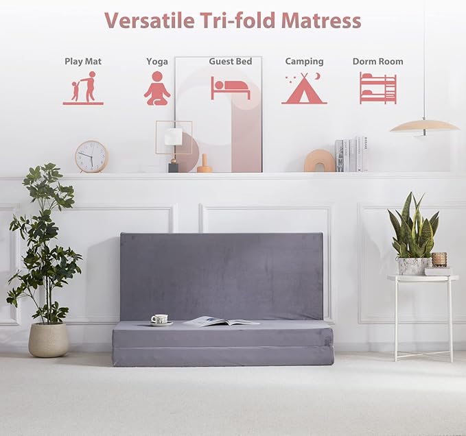 - Portable & Foldable Desig: This sponge mattress can be folded into a compact size when not in use for space-saving. Simply slip the included carrying case over the portable, tri-fold mattress and zip it up to keep it neat and secure while you travel. It is great for your guests, gaming with kids, travelling, camping, and YOGA in any room, mobile home, tent or car.