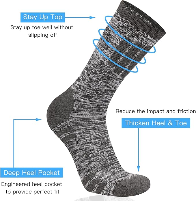 - [Fully Cushioning] Our mens hiking crew socks are specially thickened in the toe and heel areas to maintain high density and elasticity, reduce impact and friction, and effectively protect your feet from blisters.