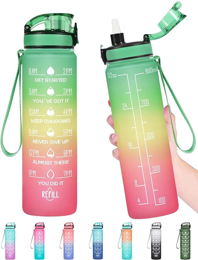 - 【Humanized Design】Water bottles with times to drink can quick open with one hand. The flip-top lid is used a secure lock, making it dust-free and leak-proof. Time water bottle is portable, light, and easy to use.