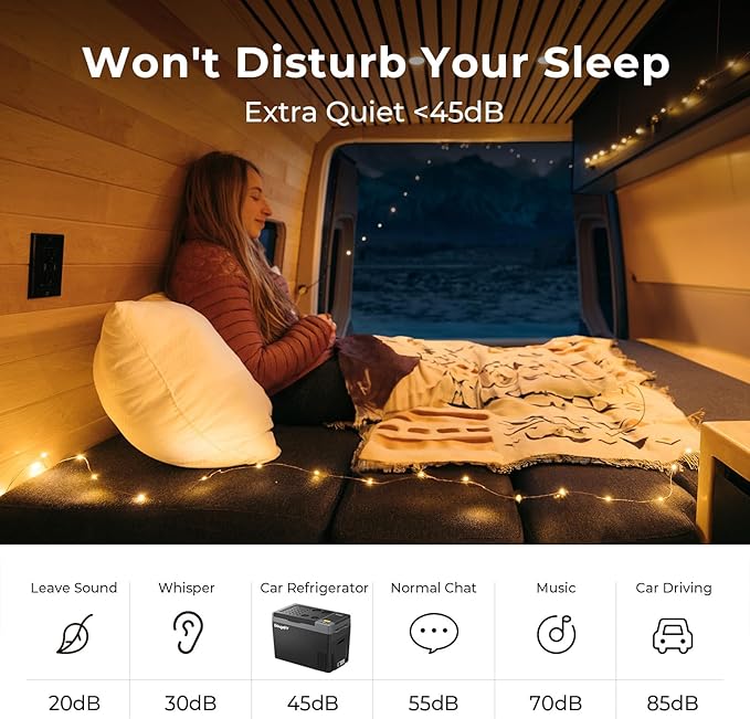 - Low Noise: The truck freezer is designed with 45dB of low noise to make sure you have a good sleep after long driving. This camping fridge also has a shock-proof design to face the uneven road, operating with no problem in case of a 30° inclination when you are off-road