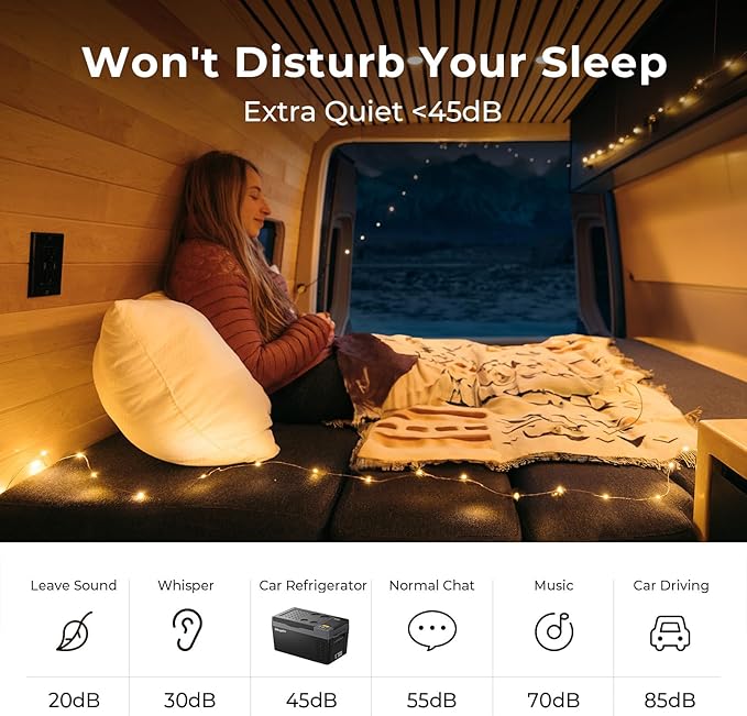 - Low Noise: The truck freezer is designed with 45dB of low noise to make sure you have a good sleep after long driving. This camping fridge also has a shock-proof design to face the uneven road, operating with no problem in case of a 30° inclination when you are off-road