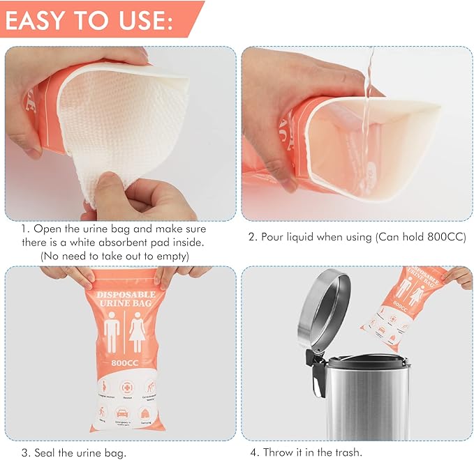 - 【Easy to Use】The emergency portable urine bag is very easy to use. Just open it and make sure there is a white absorbent pad in the pee bag before use, (no need to open or empty during use), it can hold max 800ml capacity and turn it into a gel in a short time. After use, pls seal it and throw it in the trash can.