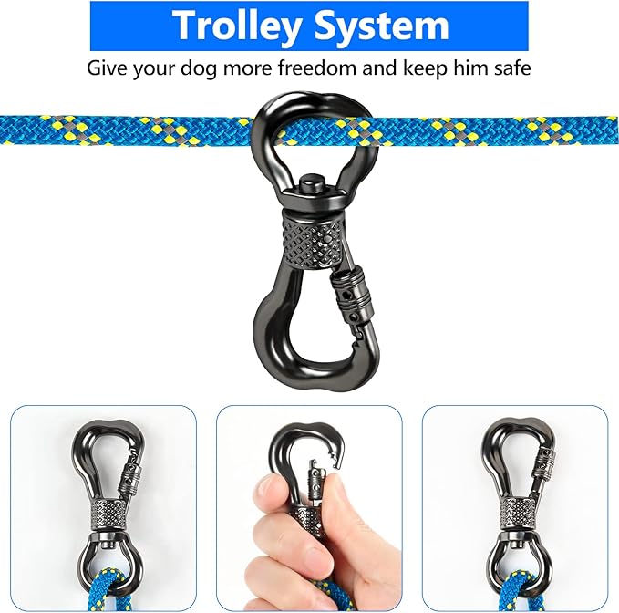 - Package Contents: Dog trolley runner includes: 50ft dog cable, 2 steel buckles, 1 360°tangle free clip and instruction sheet. The pictured leash attached to the dog is not included. If you have any questions about product set up, please feel free to contact us, any problems will be resolved in time.