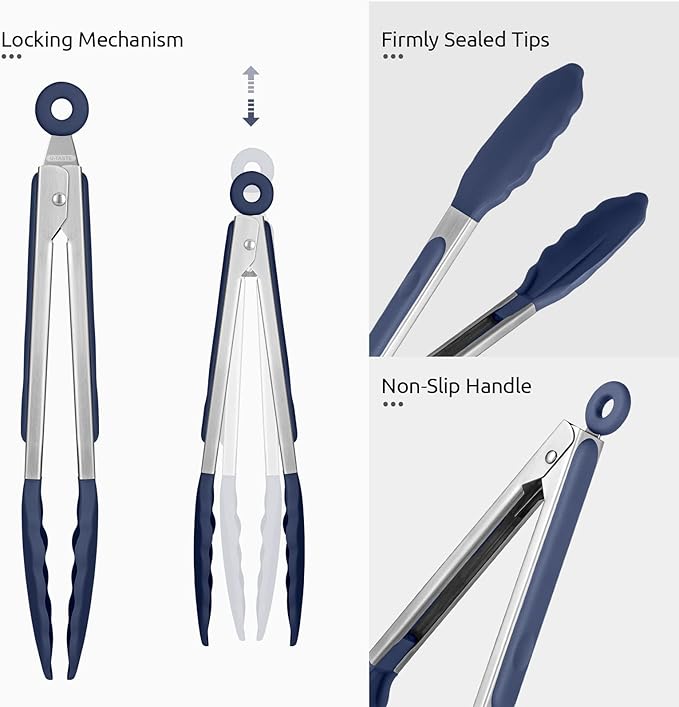 - [Heat Resistant Silicone Tips without Melting & Odor] The silicone tipped tongs are made of Food Grade silicone, which is more Sturdy and has higher heat resistance (up to 600℉) than the basic. The silicone tips make them a great partner for your nonstick pans and pots. No more sharp tips to scratch or ruin your cookware. They are heat resistant, so no more silicone parts of the tongs melt off with heat again! Thanks to fine workmanship, the silicone tips firmly sealed on never lose its grip.