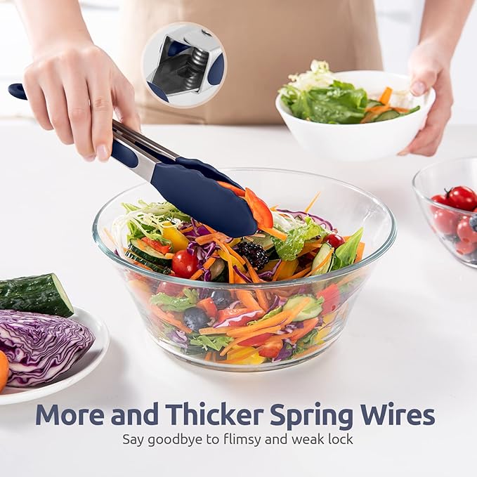 - [Dishwasher Safe & Easy to Store] After you grilling, bbq, mixing salad, frying meat/steak, serving hot dog, the food will not stick to the tongs so you can use a quick wipe and rinse it with hot soapy water or just throw them in the dishwasher. You can close them and store in your drawers to save space, or you can hang them up for easy access. These heavy duty tong utensils with multiple colors available to match your kitchen style or other accessories series.