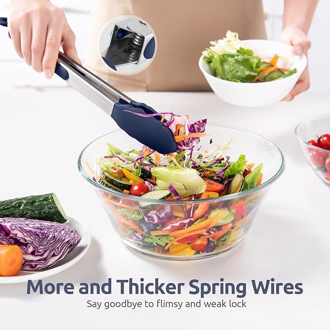 - [Dishwasher Safe & Easy to Store] After you grilling, bbq, mixing salad, frying meat/steak, serving hot dog, the food will not stick to the tongs so you can use a quick wipe and rinse it with hot soapy water or just throw them in the dishwasher. You can close them and store in your drawers to save space, or you can hang them up for easy access. These heavy duty tong utensils with multiple colors available to match your kitchen style or other accessories series.
