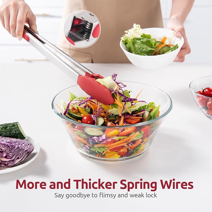 - [Easy & Ergonomic Locking Mechanism] The upgraded food serving tong has a smooth locking mechanism. With the added gaskets, you can easily lock and unlock the tongs. With more and larger 18/10 stainless steel springs, it achieves a great balance between too tight to open and too loosen to grasp food. Simply hold the open tongs closed, pull the tab out to lock them closed and push the tab in to re-open for grabbing food. The pin holds two parts of the tong is tightly, no breaking issues.
