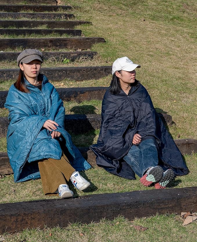 - Multifunctional. With the buttons and elastic straps, this blanket can be used as quilt, poncho, shawl, temporary sleeping bag. You can also put two blankets together and make it one two-person sleeping bag. Keeping you cozy while sitting around the fire or on your couch, lying in hammocks, reading books, tailgating, cooking meals. Perfect for camping, backpacking, hiking, mountaineering, traveling, lounging, picnics, beach trips, concert events, airplane trips, and other outdoor activities.