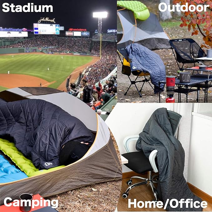 - Multifunctional. With the buttons and elastic straps, this blanket can be used as quilt, poncho, shawl, temporary sleeping bag. You can also put two blankets together and make it one two-person sleeping bag. Keeping you cozy while sitting around the fire or on your couch, lying in hammocks, reading books, tailgating, cooking meals. Perfect for camping, backpacking, hiking, mountaineering, traveling, lounging, picnics, beach trips, concert events, airplane trips, and other outdoor activities.