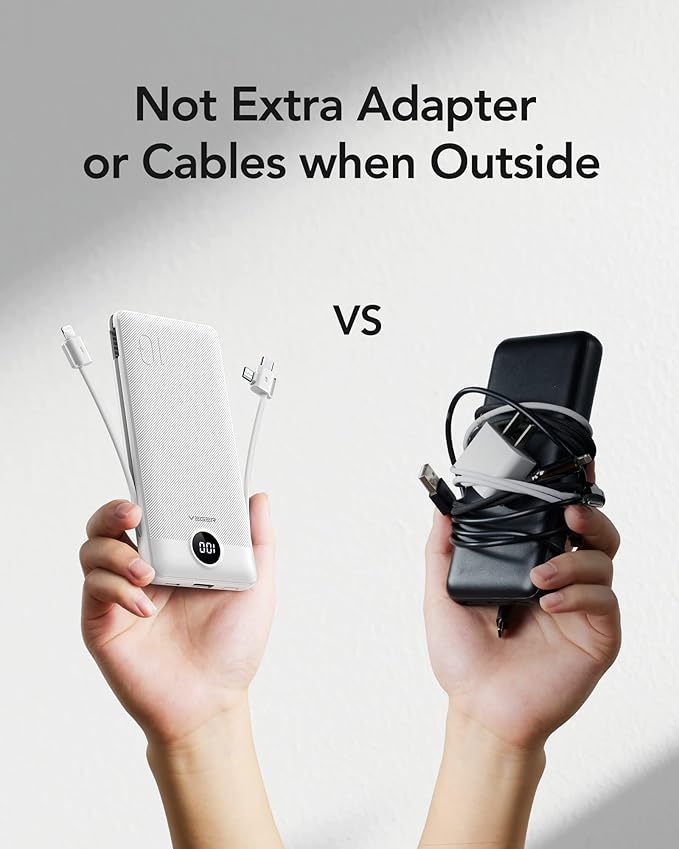 VEGER Portable Charger for iPhone Built in Cables and Wall Plug, 10000mah Slim Fast Charging USB C Power Bank, Travel Essential Battery Pack Compatible with iPhones, iPad, Samsung More Devices(White)