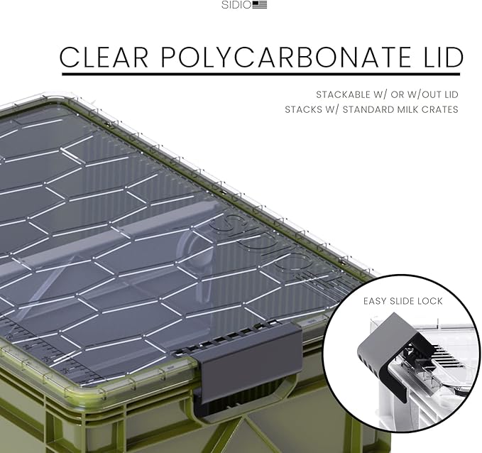 - RESISTS CRACKS, DENTS AND EXTREME TEMPERATURES. Camping, moving, or long term storage? The SIDIO crates can handle it all. Sturdy and reliable; with ergonomic handles for easy transporting, and an easy-slide polycarbonate lid that is transparent for effortless viewing of contents.