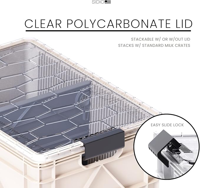 - RESISTS CRACKS, DENTS AND EXTREME TEMPERATURES. Camping, moving, or long term storage? The SIDIO crates can handle it all. Sturdy and reliable; with ergonomic handles for easy transporting, and an easy-slide polycarbonate lid that is transparent for effortless viewing of contents.
