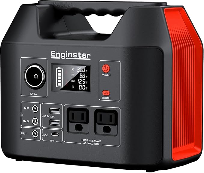 - PORTABLE BUT POWERFUL: EnginStar Portable Power Station with ETL Certification, and the portable size of 9 x 5.5 x 7.5 inches, weights only 6.5 pounds, but armed with 296wh capacity and 300W AC output, EnginStar portable power station can provide enough juice to charge your phones, laptop, camera, cpap, drone, etc. Designed with 8 output ports can charge several devices at the same time, which make it a perfect emergency battery, outdoor and camping backup battery