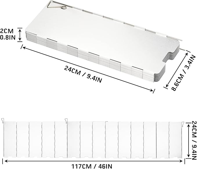 - [Large Size] Unfold camping stove windscreen size: 9.44 x 46 inch/24 x 117 cm, fold stove windscreen size: 9.44 x 3.38 inch/24 x 8.6 cm. This folding stove windshield is tall and large to protect the flame from being blown around.
