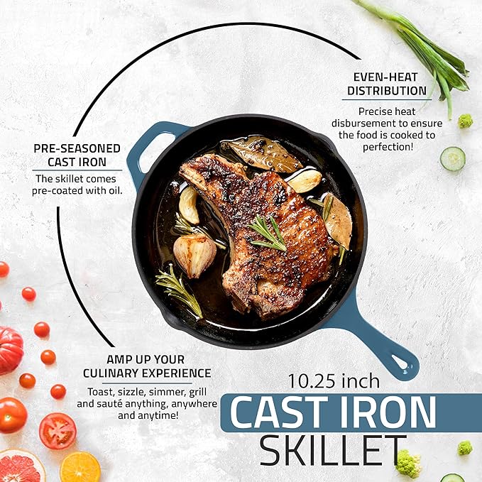Utopia Kitchen Cast Iron Frying Pan 10.25 Inch, Cast Iron Chefs Pan, Pre Seasoned Skillet, Safe Grill Cookware for Indoor & Outdoor Use, Teal
