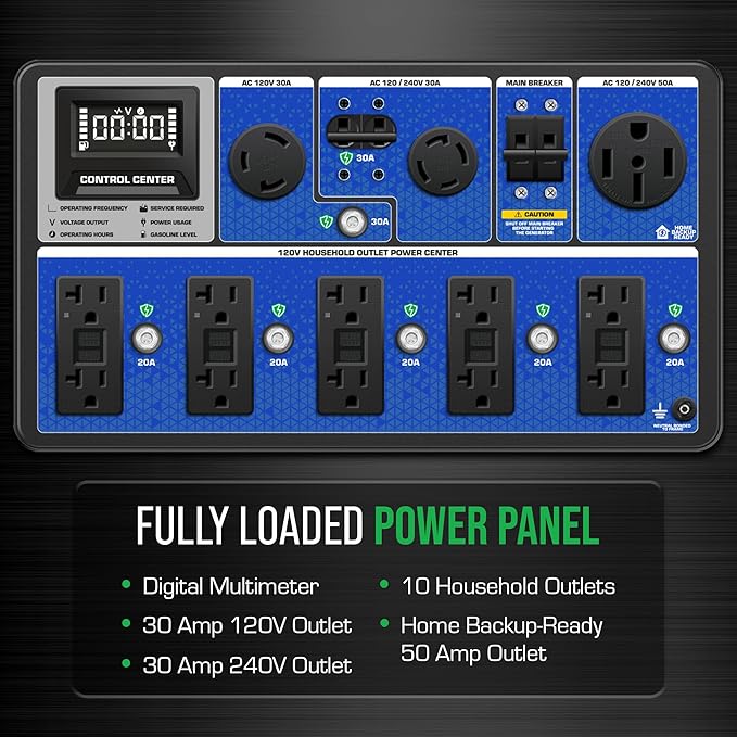 - The fully loaded power panel includes five 120V GFCI household outlets, one 120V 30AMP outlet, one 120/240V 30AMP twist-lock outlet, and a heavy-duty 120/240V 50AMP outlet making it transfer switch ready!