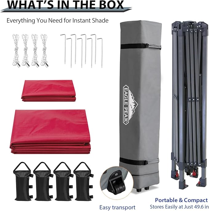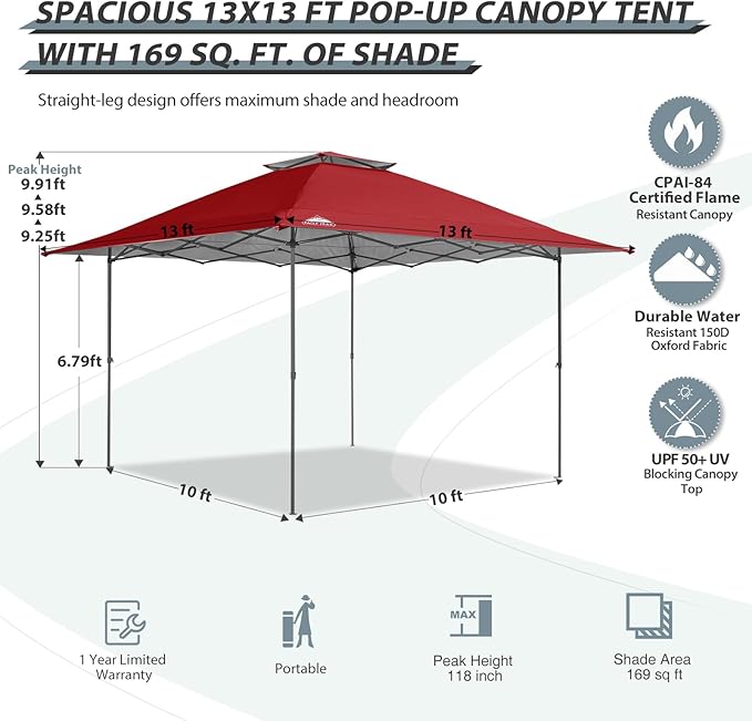 EAGLE PEAK 13x13 Straight Leg Pop Up Canopy Tent Instant Outdoor Canopy Easy Single Person Set up Folding Shelter w/Auto Extending Eaves 169 Square Feet of Shade (Red)