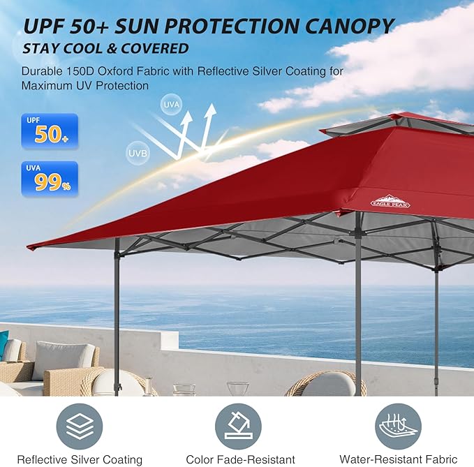 - VENTED TOP & AUTOMATIC EXTENDED EAVES: Stay cool with the EAGLE PEAK VENT that allows for greater airflow while you work or relax. The canopy’s automatically extending eaves open without any manual assembly and, combined with a sturdy straight-leg design, provides maximum coverage so 8 or more people can enjoy the spacious 169 square feet of shade. The easily adjustable telescoping 3-position steel frame is perfect for adjusting the canopy for your preferred coverage