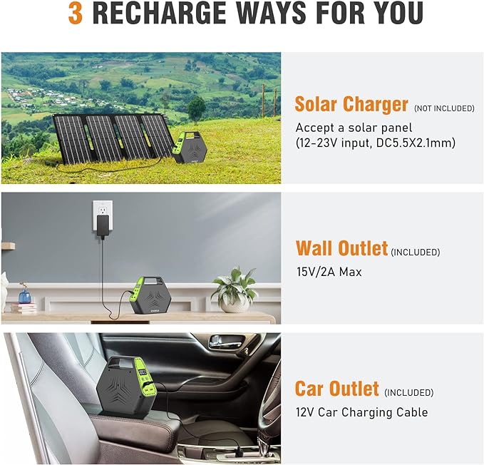 - 【Warm Tips for You】 Please kindly be noted it can only charge/power your devices that less than 100W and check out the operating power of your device before use. Please recharge and use this portable generators at least once every three months, and turn off the AC output when not in use. This unit accept 13V - 23V input (DC 5.5 x 2.1mm) from a solar panel with an output.