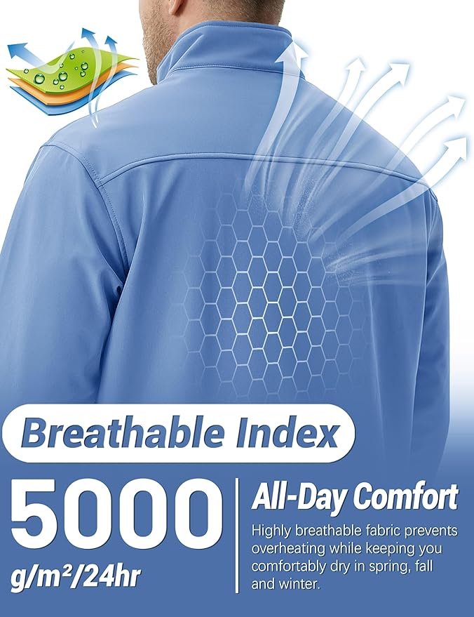 • Waterproof & Breathable——TACVASEN mens softshell jacket features a high-performance waterproof fabric (10,000mm rating) and a breathable lining (5,000g/m²/24hr) to block rain while keeping you dry and comfortable.