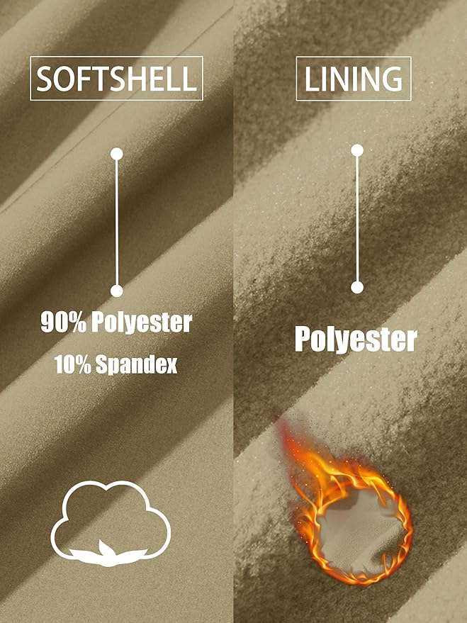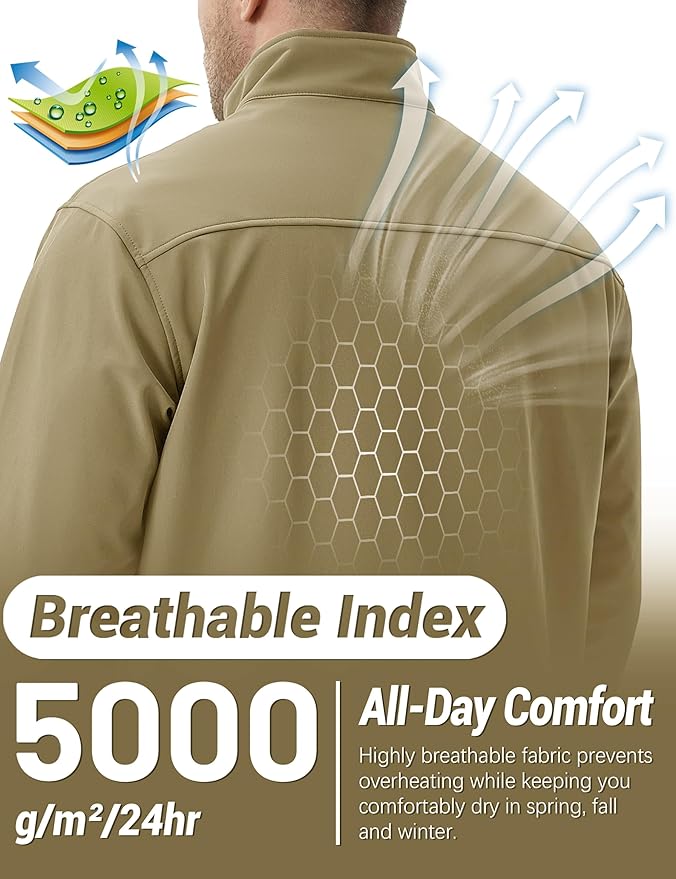 - Waterproof & Breathable——TACVASEN mens softshell jacket features a high-performance waterproof fabric (10,000mm rating) and a breathable lining (5,000g/m²/24hr) to block rain while keeping you dry and comfortable.