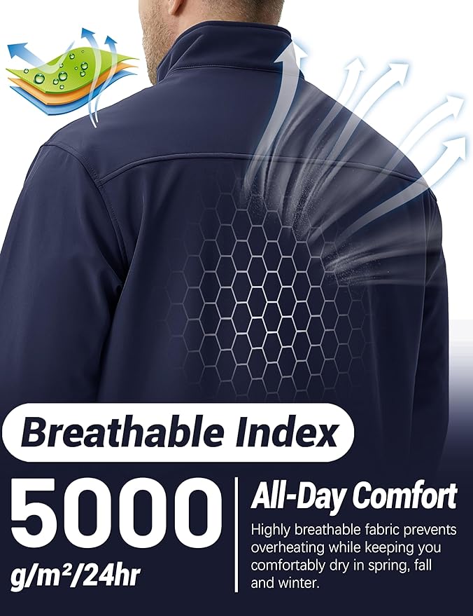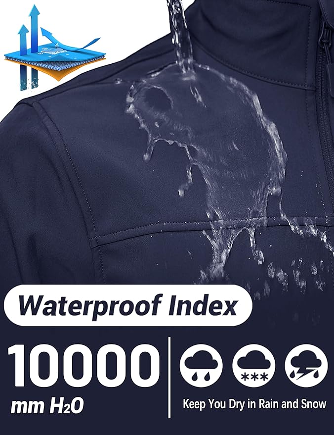 - Waterproof & Breathable——TACVASEN mens softshell jacket features a high-performance waterproof fabric (10,000mm rating) and a breathable lining (5,000g/m²/24hr) to block rain while keeping you dry and comfortable.