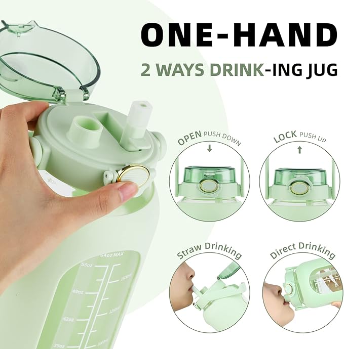 - More Function :The water jug with straw is designed with high-quality silicone sleeve to protect water bottle from slight bumps. In order to make the half-gallon(2 liters) big gym motivational water bottle easy to carry we have equipped it with handle. Wide-mouth opening make it easy to fill with ice cubes & fruits and daily clean