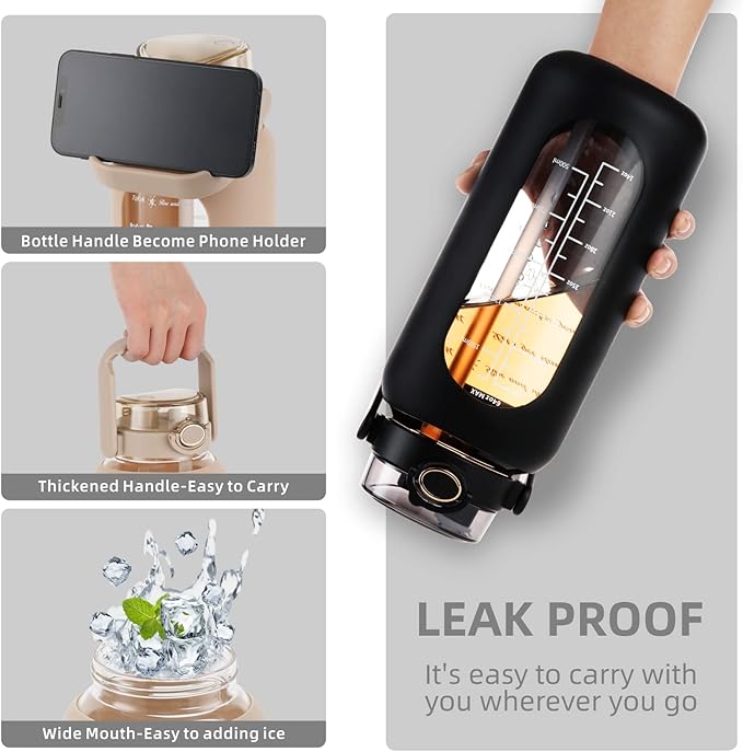- Glass Water Bottle 64oz :The water jug with straw is designed with high-quality silicone sleeve to protect water bottle from slight bumps. In order to make the half-gallon(2 liters) big gym motivational water bottle easy to carry we have equipped it with handle. Wide-mouth opening make it easy to fill with ice cubes & fruits and daily clean