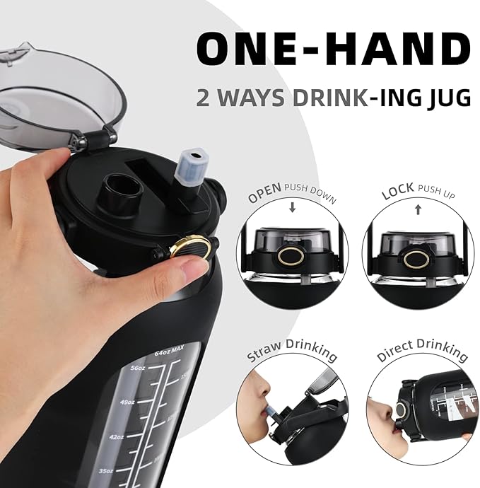 - Glass Water Bottle with Handle Lid : This half gallon water bottle featured with latest pop up lid with silicone O-ring, secure lock & dust cover, the large glass bottle has two ways to drink water There's both a silicone straw and a hole that can be drank from directly , which is very convenient and fast