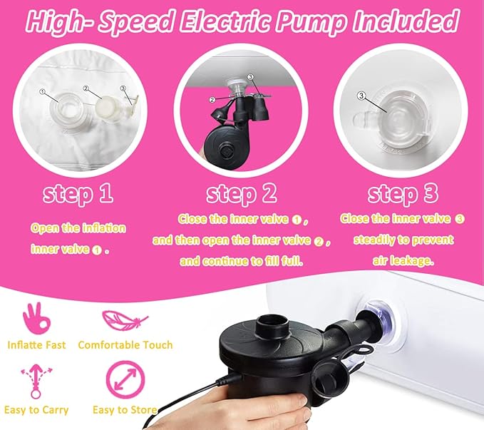 - All In One Set:This travel bed set comes with everything you need. Included is 1*Air mattress(inflated:62*40*12'') ,1* electric pump(three nozzles),1*AC adapter, 1*cigaratte lighter adapter,1*carry bag. Any problem you met please feel free to contact us, we are standing behind our product and will give you a satisfied answer.