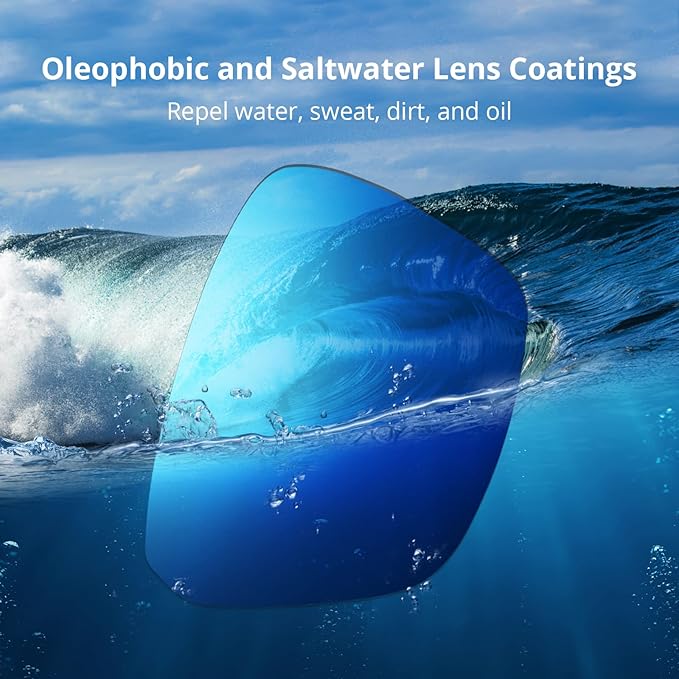 - KEY FEATURES – Oleophobic lens coating repels saltwater, oil, and chemicals - Polarized lenses reduce glare - Impact resistant TAC lenses protect your eyes from flying objects - Block 100% of the harmful UVA and UVB rays - Super Lightweight, durable, and flexible Grilamid frames