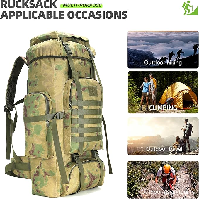 • 【Large-capacity Loading】: 80/70L large-capacity camping backpack, large-capacity main storage + 4 external system, the main bag can hold clothes, sleeping bags and travel items, and can hold 2-3 people travel equipment. Four external systems can be used for daily necessities + side water bottles.