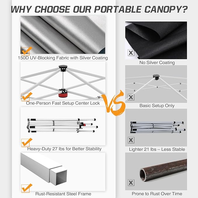 - SUPERIOR QUALITY: UPF 50+ UV protection, water resistance, CPAI-84 flame resistance, 150D oxford fabric canopy top. Frame is powder-coated, rust-resistant, high-grade engineered steel, with hardened M5 bolts and nylon connection hardware for maximum durability