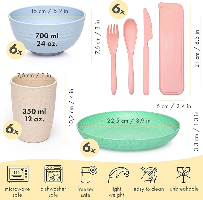 FOODLE Wheat Straw Dinnerware Set - BPA Free & Safety Certified - Lightweight & Unbreakable - Microwave & Dishwasher Safe - Camping, Dorm & RV Dishes - Reusable Kids Plates and Bowls Sets - For 6