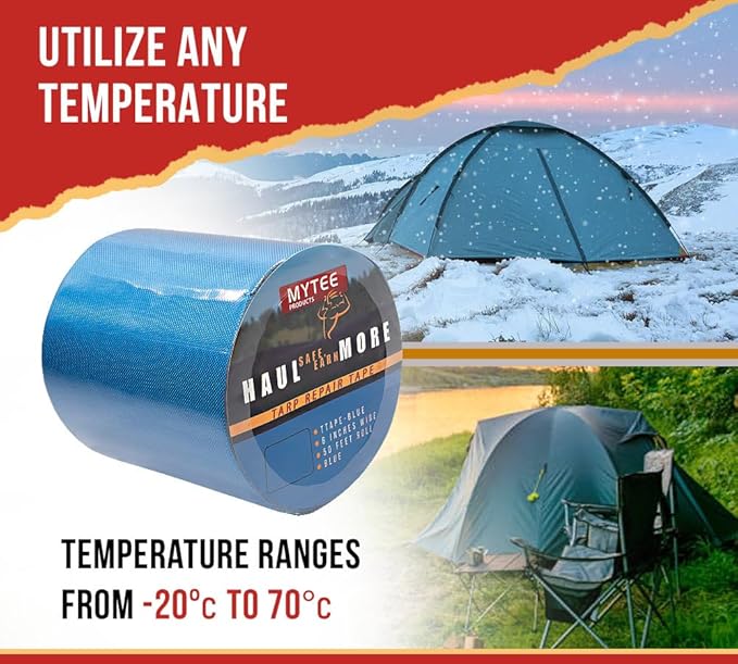 Mytee Products 8.8 oz Waterproof Blue Vinyl Tarp Repair Tape 6 Inch x 50 FT with Heavy Duty Adhesive Backing - Tarp Patch Kit, Tarp Repair Kit
