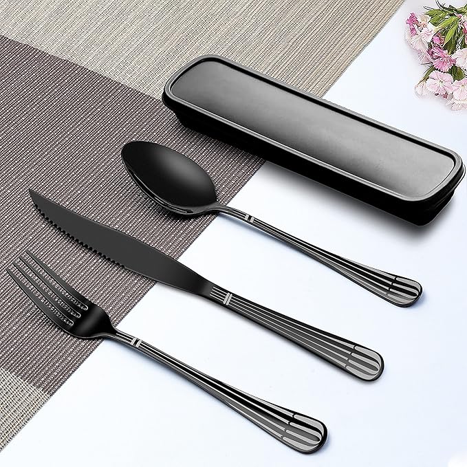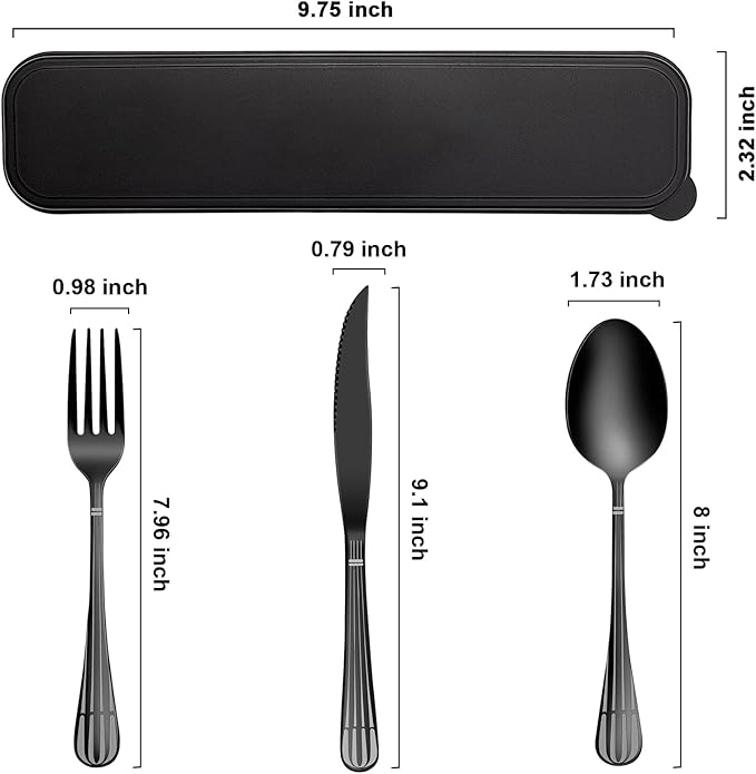 - Portable Cutlery Set with Case: 3 pieces reusable cutlery set with case, consist of 1 Dinner Forks+1 Dinner Spoons+ 1 Steak Knives+1 portable carrying case