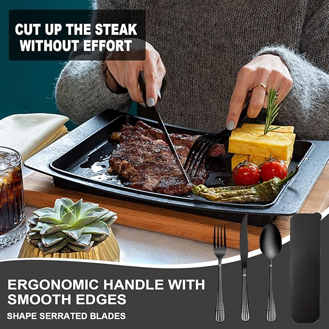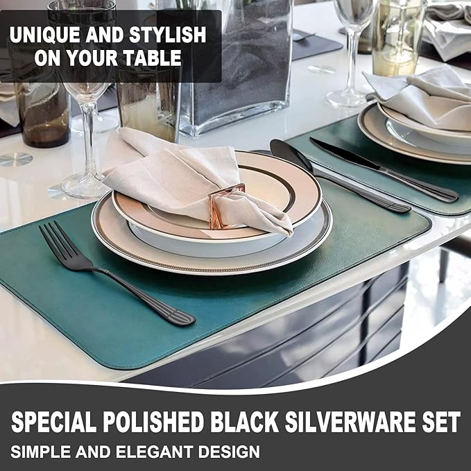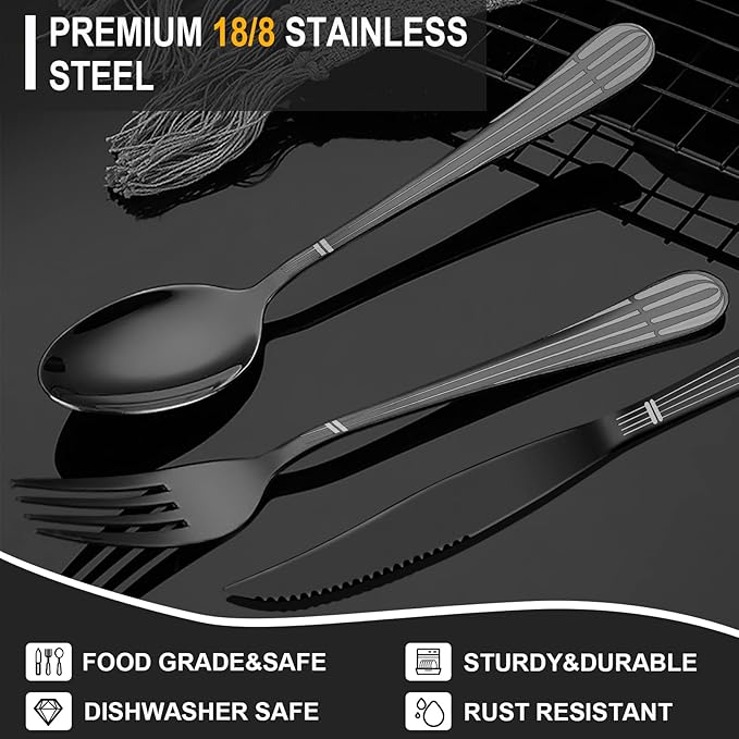 - Unique Elegant Look: Black shinning metallic look with unique and beautiful laser stripes stands out from the ordinary silverware, creating an modern, stylish, noble and luxurious dining scenes. There is no need to worry about fading or cracking