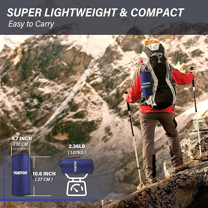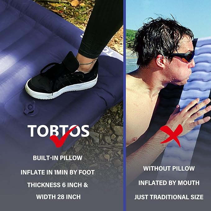 - Extra Thick Camping Pad: TOBTOS sleeping pad is wider and thicker than others on the market. It can be up to 6 in thick once full of air, which is our biggest advantage. It can stay away from the hard ground and sleep comfortably in any sleeping position