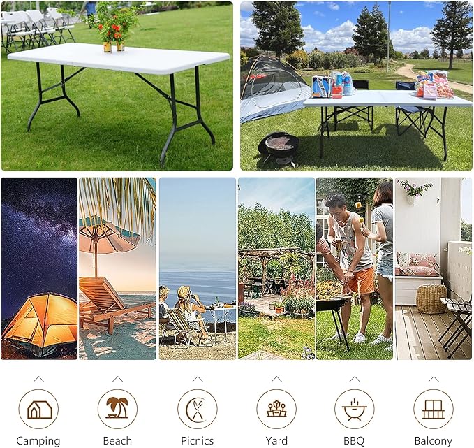 - ๐Multiple Uses:The Outdoor Dining Table is light-weight and fold in half design,it is perfect for both indoor & outdoor use, such as parties,BBQ,weddings, camping, garden, dining.