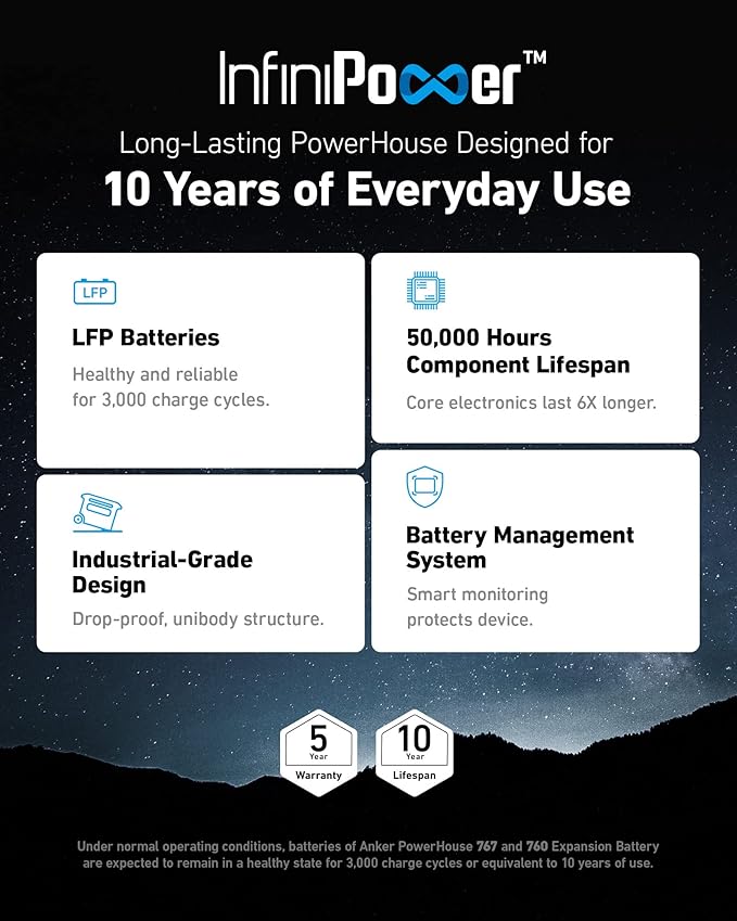 - Long-Lasting Portable Power Station With a 10-Year Lifespan: With our proprietary long-lasting technology InfiniPower, combined with LiFePO4 batteries, ultra-durable electronic components, a smart temperature control system that monitors temperature up to 100 times per second, and impact-resistant structural design, Anker PowerHouse 767 (GaNPrime PowerHouse 2048Wh) and Anker 760 Portable Power Station Expansion Battery (2048Wh) are built to last over a decade, even with everyday use.