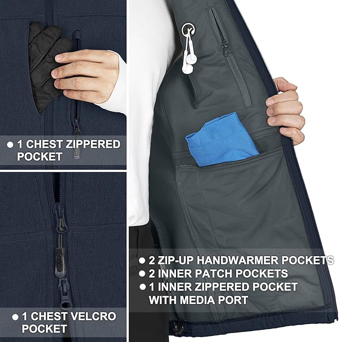 - UTILITY VEST WITH 7 POCKETS---2 zip-up hand-warmer pockets and 2 chest (1 zippered & 1 velcro) pockets for quick access are spacious to keep your stuff safe and secure. 1 inner zip deep pocket and 2 patch pockets are perfectly sized for your cell phone, wallet, gloves, etc.