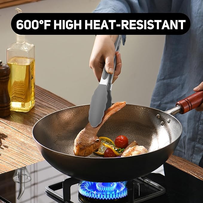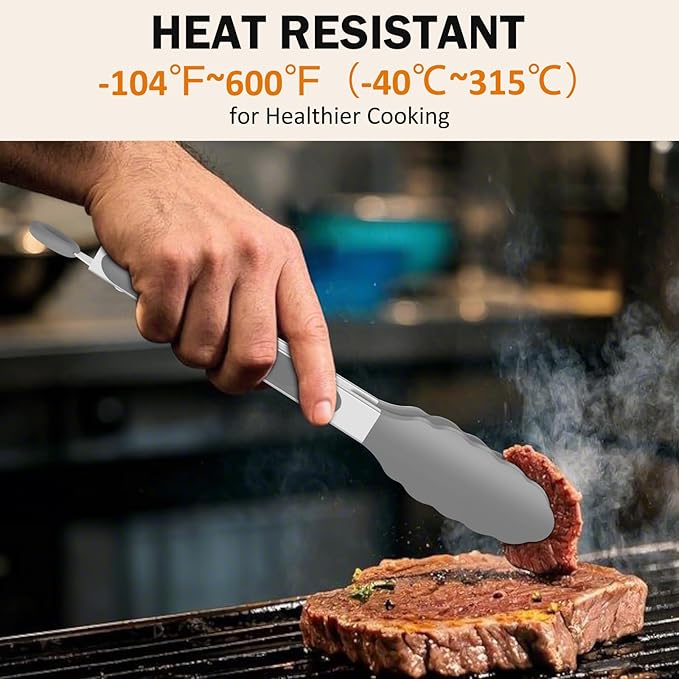 - 600ºF High Heat-Resistant: The silicone tongs feature BPA free silicone tip that will not scratch your nonstick cookware. Scalloped edges securely hold food. EEKEDO Tongs are great for frying, grilling, stirring, and serving. Non-stick surface easy to rinse, dishwasher safe.