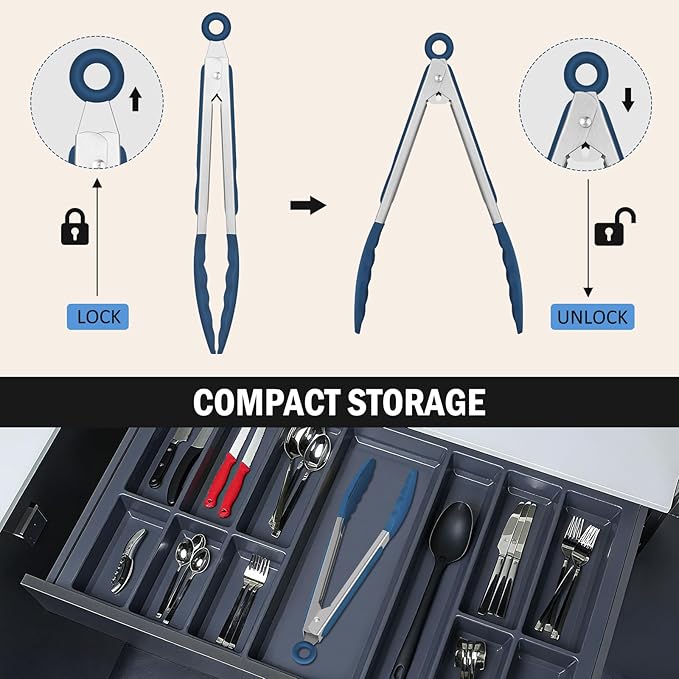 - Locking Mechanism: This Cooking tongs have a ring pull locking mechanism, pull the ring for lock to save space, and push for open can be one-hand opration. Also include a hanging ring for easy hang and storage.