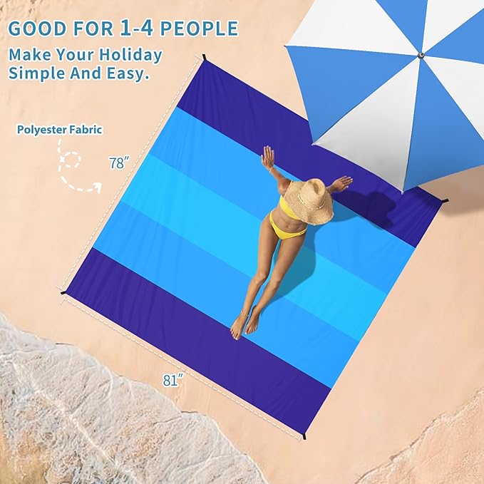 - ๐ดBeach Blanket Waterproof Sandproof:78''ร81''size beach blanket,suit for 1-4 adults. Made by parachute fabric,odorless,tear-resistant 210T polyester.Light weight and small after folding.Only 12 oz,small and mighty,which is easy to carry!